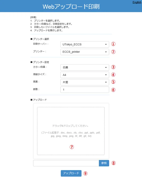 - ③,④,⑤,⑥に印刷条件を設定した後に,⑦のエリアに印刷データをドラッグ&ドロップしてください.ドラッグ&ドロップの代わりに⑧の参照ボタンをクリックして,ファイルを指定することもできます.
