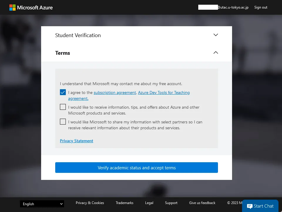 @utac.u-tokyo.ac.jpto indicate your affiliation with UTokyo (e.g.,0123456789@utac.u-tokyo.ac.jp). - After signing in, you will be taken to the “Student Verification” and “Terms” screens sequentially. Follow the instructions on the screen to proceed.