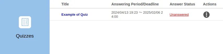 Assignments, quizzes, and surveys are all created by your course instructor (except for class surveys) and are displayed in the respective columns on the Course Top screen. Clicking the respective title will take you to the submission • response screen, where you can submit or answer it.