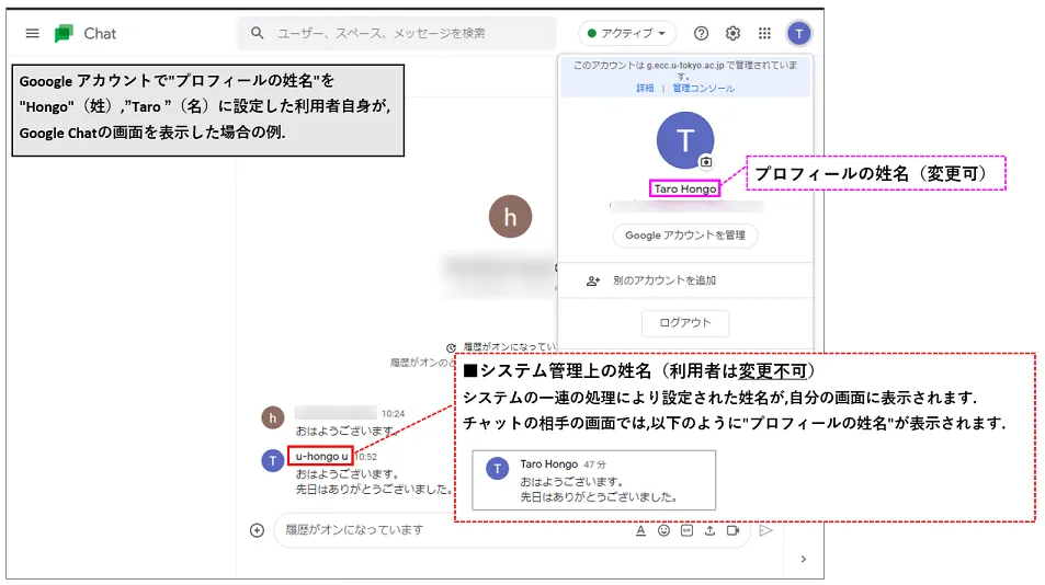 - Google Chatを利用する際や,ファイルやGoogleカレンダーの共有を行う場合に,相手に通知される姓名です.