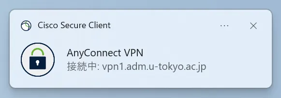 手順H: 再度Cisco Secure Clientをクリックし,現在の状態を確認します.表示された画面で,以下のように「vpn1.adm.u-tokyo.ac.jpに接続されています」と表示されていれば,お使いの機器はUTokyo VPNに接続している状態です.