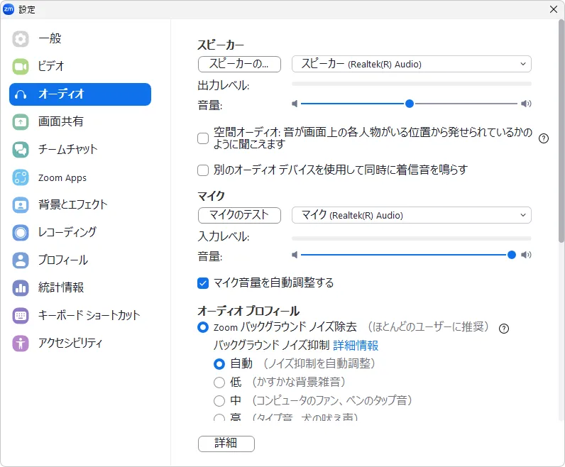 - 背景雑音(バックグラウンドノイズ)の抑制:参加者の音声以外の音を抑制する機能です.「自動」「低」「中」「高」の4種類がありますが,基本的にはデフォルトの「自動」のままで問題ありません.「自動」で音声が聞き取りにくい場合は変更してください.