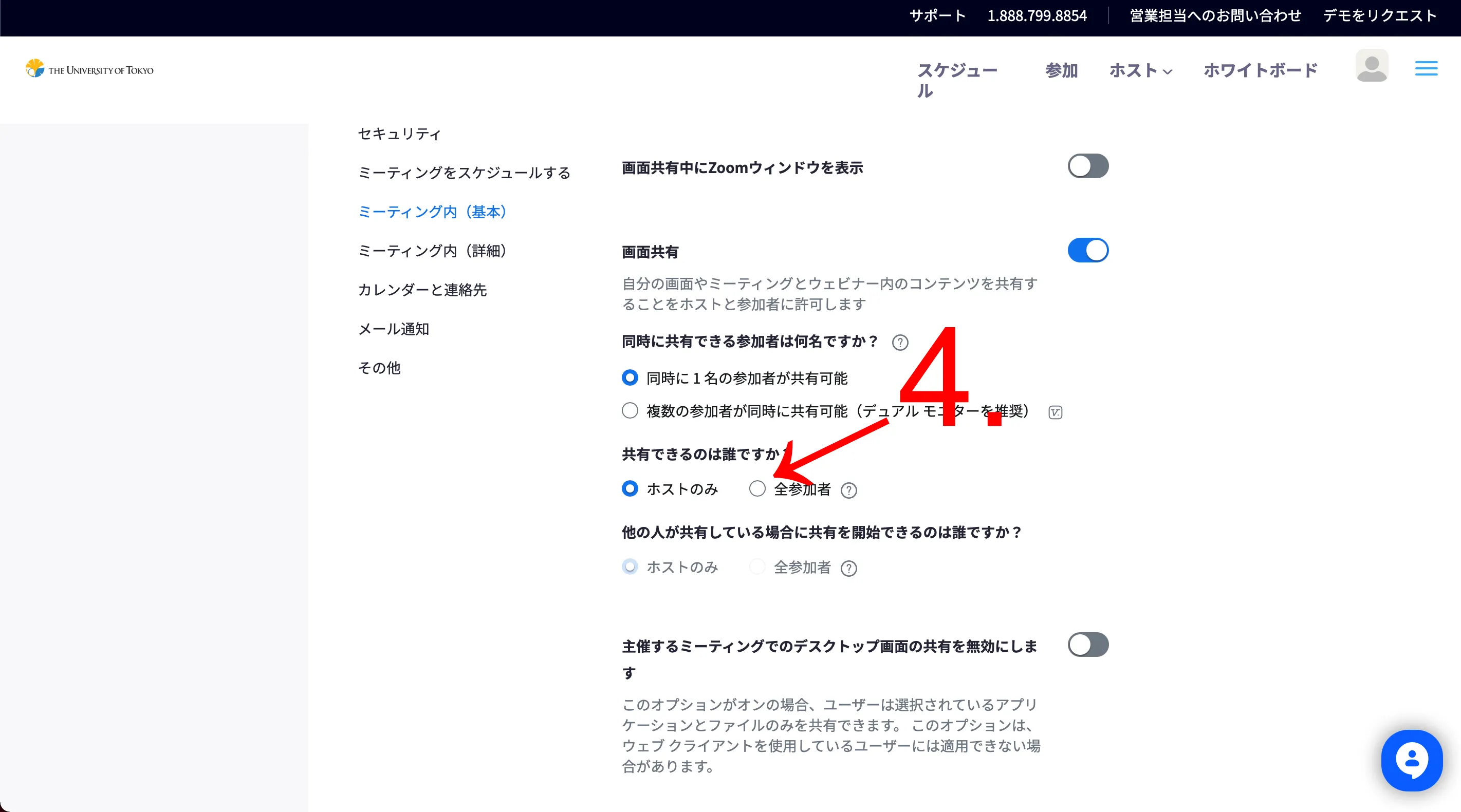 - 画像のような設定画面が表示されていることが確認できたら,「ミーティング内(基本)」の中の「画面共有」の項目までスクロールしてください.